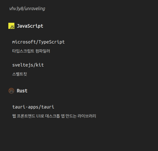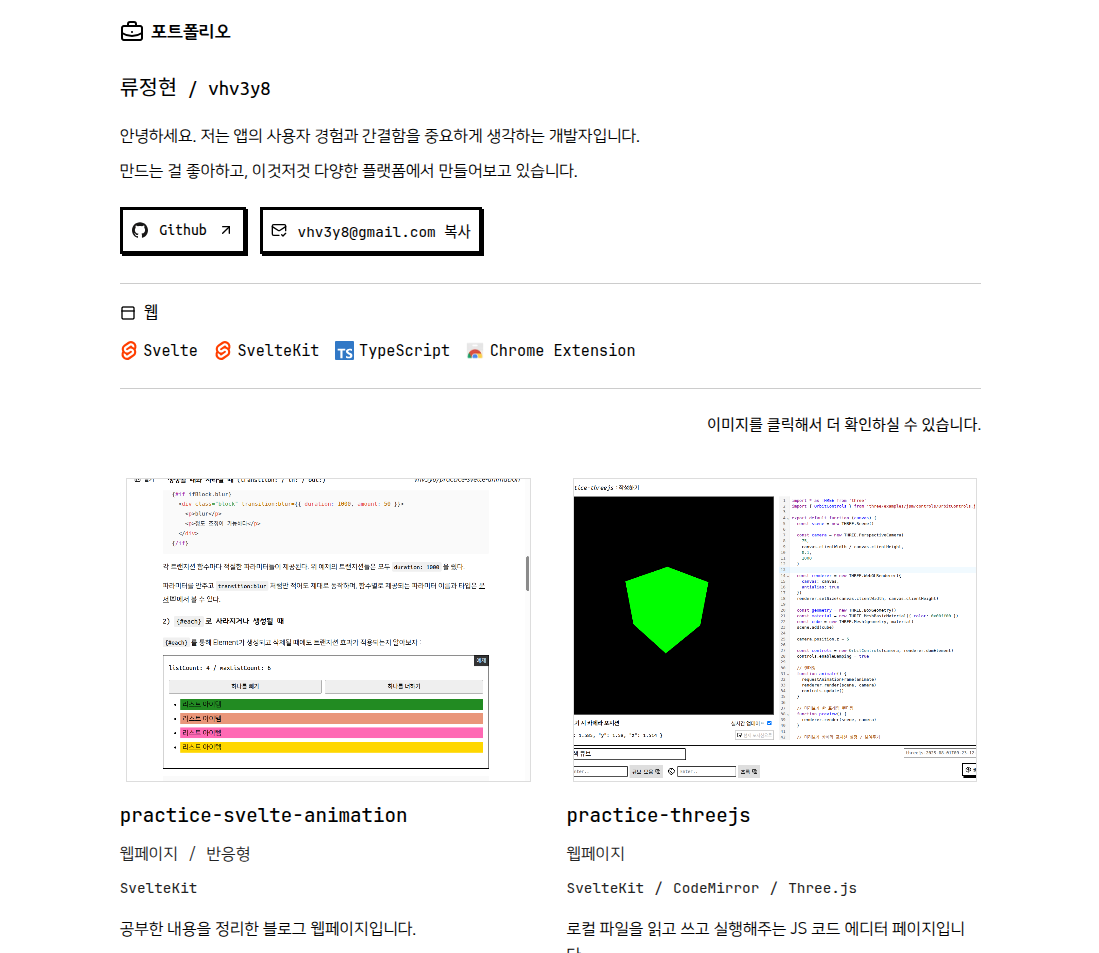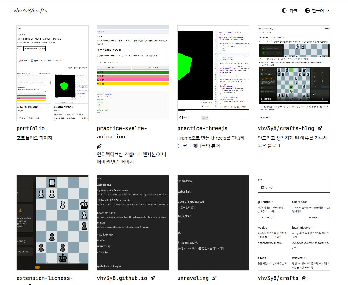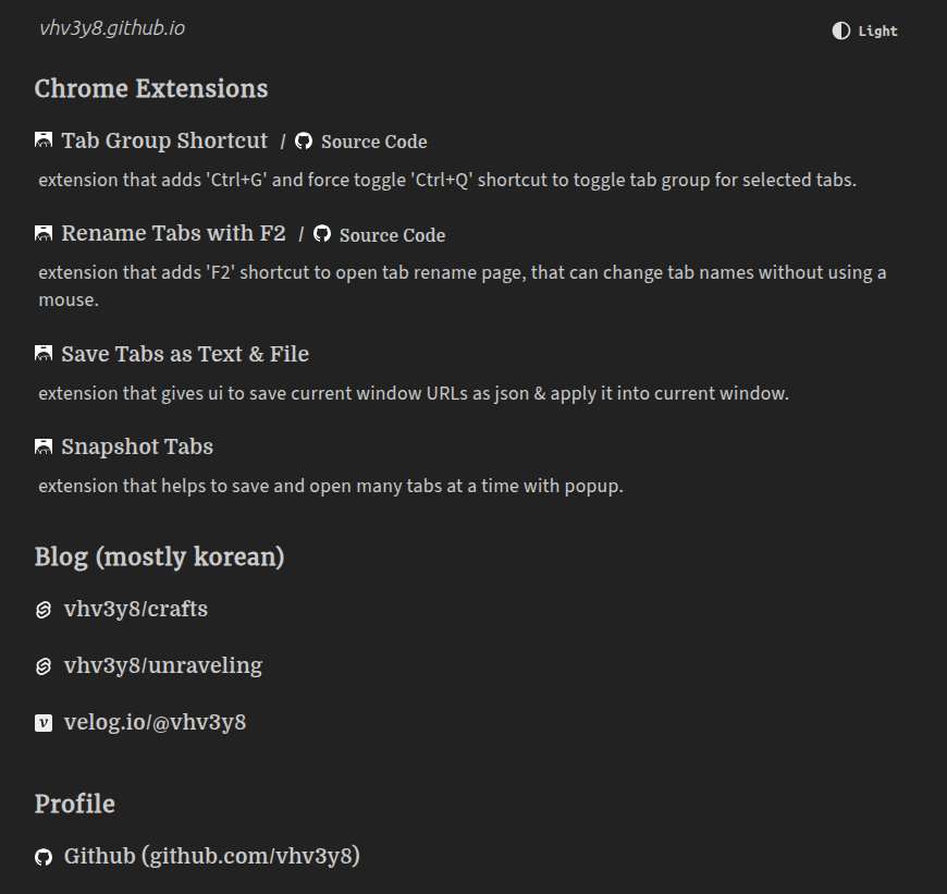 깃허브 프로필을 확장한 느낌의 영어 페이지